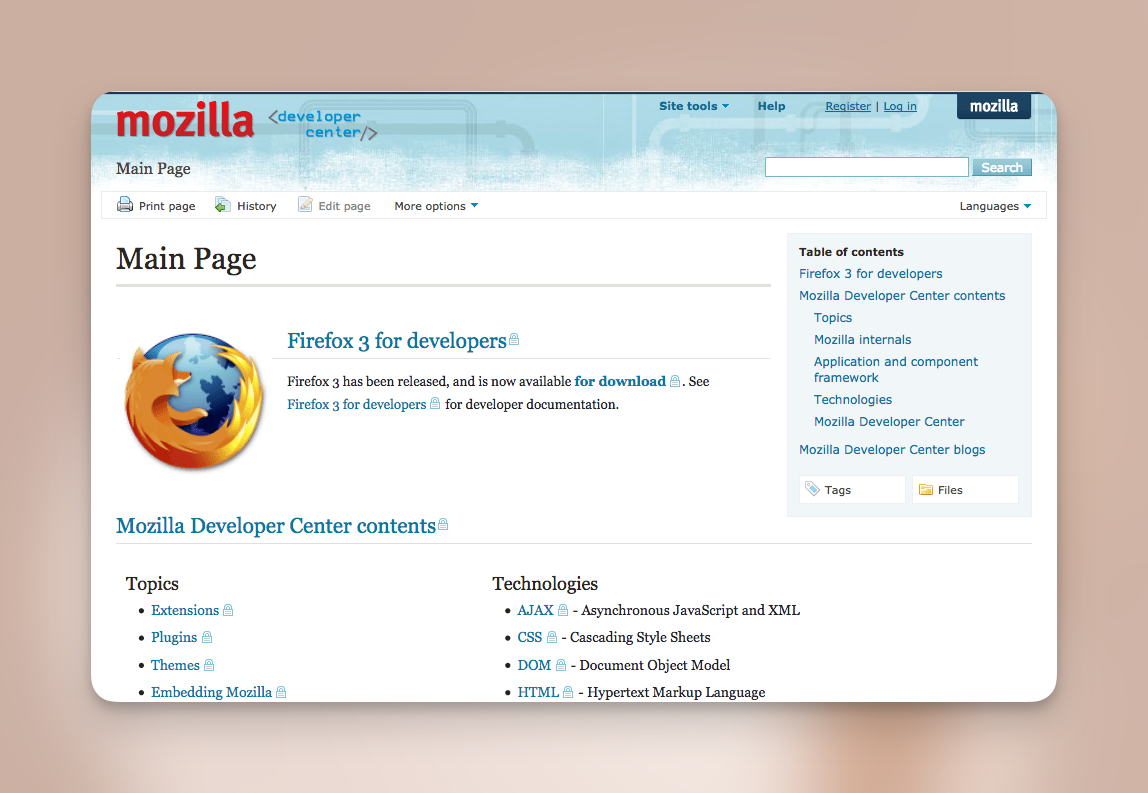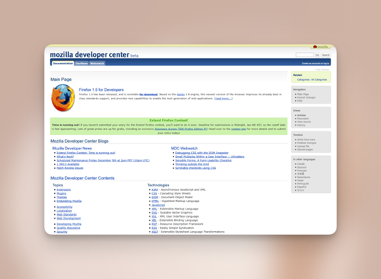 - 2005 年Mozilla 公司以 「Mozilla 开发者中心」的名义启动了该项目,从而开启了开源文档的新时代,至今仍然为其项目的服务器和员工提供资金。